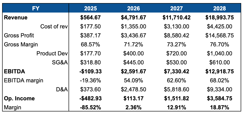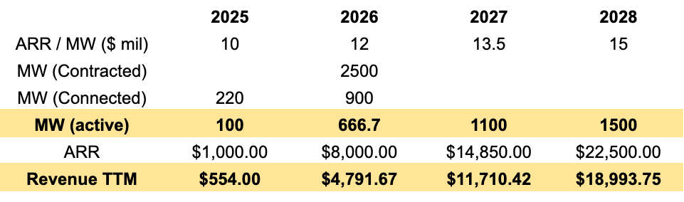 Calculated TTM Revenue by applying a linear monthly growth rate to get from implied Dec-25 revenue ($83.3 mil. from 2025 ARR) → Dec-26 revenue ($666.6 mil. from 2026 ARR), with the same logic applied until Dec-28 revenue. In reality, the monthly revenue growth won’t be as linear and consistent; and it will greatly depend on the timing of contracts and deployment of new capacity - which is something difficult to forecast.