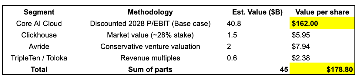The sell-off presents a classic market dislocation. Investors are currently pricing the stock solely on the immediate risks of the core infrastructure build-out (dilution, Capex intensity, jitters around AI market as a whole) while ignoring the immense earnings power of the 2027-2028 roadmap and arguably assigning zero value to a portfolio of unicorns (Avride, ClickHouse) embedded within the holding company.