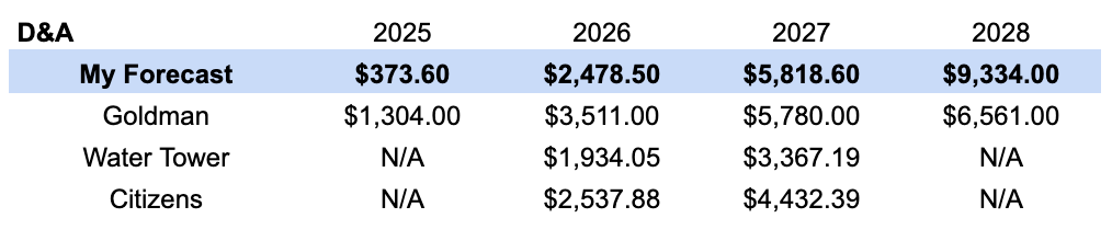 This would lead to $17.6B in cumulative D&A between 2026-2028. The table below shows the yearly breakdown (quarterly breakdown to be shown in the Income Statement section), compared also to what analysts have forecasted. While my D&A may seem more pessimistic, it’s possible the analysts assumed Nebius would stop at the 900 MW mark , rather than keep investing → estimated less Capex (+ also less revenue).