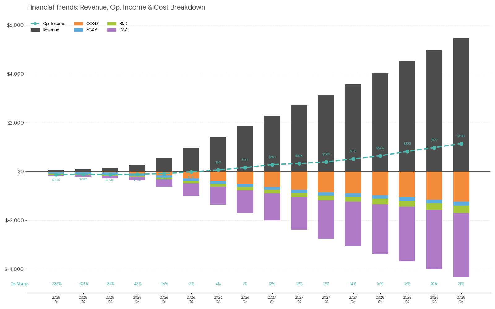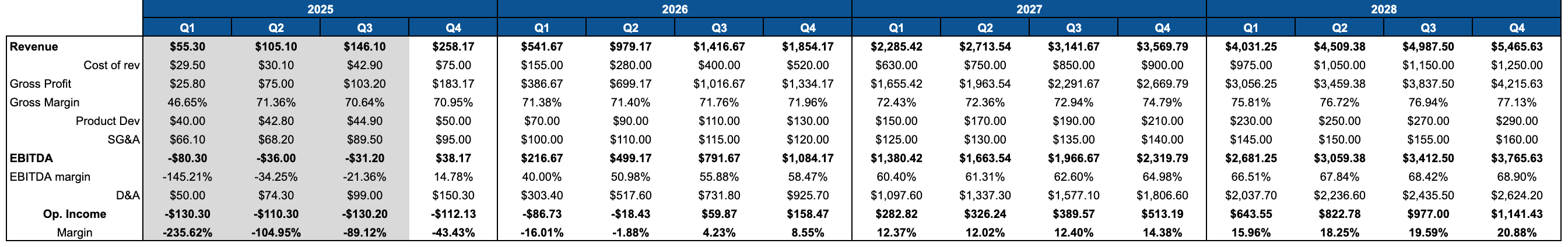 Operating margins are the ones getting hit by the aggressive D&A, but still projected to get to 19% for year 2028 and peak by quarter at ~21% in Q4 2028.